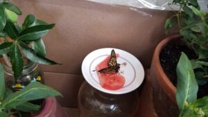 I promised you all better pictures of my two new Monarch butterflies and here they are! This is their first meal of fresh watermelon. I was able to place them on it and they took right to it. YAY!!!